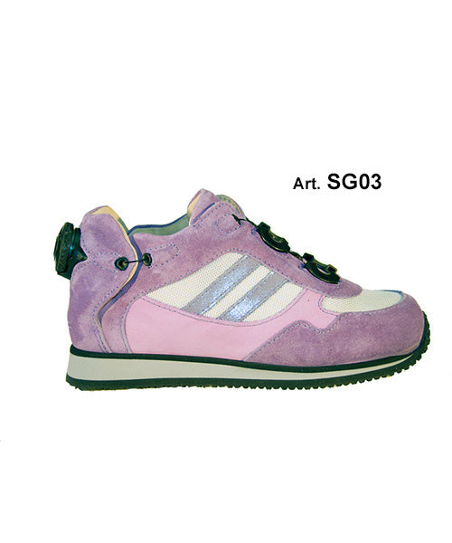 Footwear designed to be worn with foot orthoses. An innovative system for putting on shoes. The heel of the footwear is completely tiltable, which allows you to easily insert the foot and the orthosis into the shoe. The toe of the shoe is wide, which allows the front of the orthosis to be precisely positioned to the very end of the shoe. The instep is very high to accommodate the closing elements of the orthosis. The whole thing is secured with a system of strings that tighten on the foot using the unique, patented Boa system. The sole of the footwear is flexible, shaped like a boat to help the foot roll. Optional Flexi version of the sole, with even greater flexibility. The heel of the footwear can be semi-circular, helping the foot roll, or flat, for children who cannot walk and wear stiff orthoses. Optionally, the inside footwear is made of perforated, breathable material.