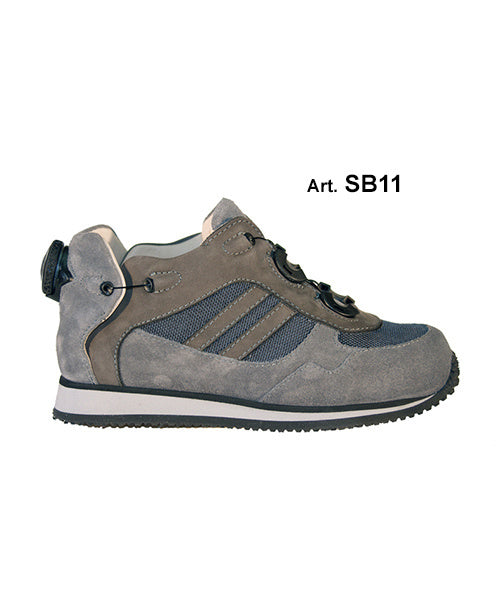 Footwear designed to be worn with foot orthoses. An innovative system for putting on shoes. The heel of the footwear is completely tiltable, which allows you to easily insert the foot and the orthosis into the shoe. The toe of the shoe is wide, which allows the front of the orthosis to be precisely positioned to the very end of the shoe. The instep is very high to accommodate the closing elements of the orthosis. The whole thing is secured with a system of strings that tighten on the foot using the unique, patented Boa system. The sole of the footwear is flexible, shaped like a boat to help the foot roll. Optional Flexi version of the sole, with even greater flexibility. The heel of the footwear can be semi-circular, helping the foot roll, or flat, for children who cannot walk and wear stiff orthoses. Optionally, the inside footwear is made of perforated, breathable material.