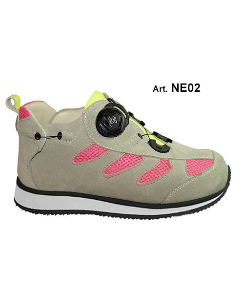 Obuwie przeznaczone do noszenia wraz z ortezami stopy. Nowatorski system zakładania obuwia. Pięta obuwia jest całkowicie uchylna, co pozwala na bezproblemowe wsunięcie do buta stopy wraz z ortezą. Nosek obuwia jest szeroki, co pozwala na dokładne dosunięcie przodu ortezy do samego końca buta. Podbicie bardzo wysokie, tak aby zmieścić elementy zamykające ortezy. Całość zabezpieczona systemem żyłek zaciskających się na stopie poprzez unikalny, opatentowany system Boa. Podeszwa obuwia jest elastyczna, ukształtowana na zasadzie łódki, aby wspomagać przetoczenie stopy. Opcjonalnie wersja Flexi podeszwy, o jeszcze większej elastyczności. Pięta obuwia może być półokrągła, wspomagająca przetoczenie stopy, lub płaska, dla dzieci nie chodzących, noszących sztywne ortezy. Opcjonalnie obuwie wewnątrz wykonane jest z perforowanego, oddychającego materiału.