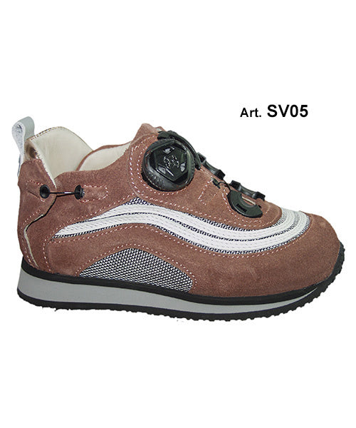 Obuwie przeznaczone do noszenia wraz z ortezami stopy. Nowatorski system zakładania obuwia. Pięta obuwia jest całkowicie uchylna, co pozwala na bezproblemowe wsunięcie do buta stopy wraz z ortezą. Nosek obuwia jest szeroki, co pozwala na dokładne dosunięcie przodu ortezy do samego końca buta. Podbicie bardzo wysokie, tak aby zmieścić elementy zamykające ortezy. Całość zabezpieczona systemem żyłek zaciskających się na stopie poprzez unikalny, opatentowany system Boa. Podeszwa obuwia jest elastyczna, ukształtowana na zasadzie łódki, aby wspomagać przetoczenie stopy. Opcjonalnie wersja Flexi podeszwy, o jeszcze większej elastyczności. Pięta obuwia może być półokrągła, wspomagająca przetoczenie stopy, lub płaska, dla dzieci nie chodzących, noszących sztywne ortezy. Opcjonalnie obuwie wewnątrz wykonane jest z perforowanego, oddychającego materiału.