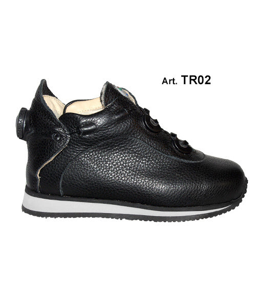 Obuwie przeznaczone do noszenia wraz z ortezami stopy. Nowatorski system zakładania obuwia. Pięta obuwia jest całkowicie uchylna, co pozwala na bezproblemowe wsunięcie do buta stopy wraz z ortezą. Nosek obuwia jest szeroki, co pozwala na dokładne dosunięcie przodu ortezy do samego końca buta. Podbicie bardzo wysokie, tak aby zmieścić elementy zamykające ortezy. Całość zabezpieczona systemem żyłek zaciskających się na stopie poprzez unikalny, opatentowany system Boa. Podeszwa obuwia jest elastyczna, ukształtowana na zasadzie łódki, aby wspomagać przetoczenie stopy. Opcjonalnie wersja Flexi podeszwy, o jeszcze większej elastyczności. Pięta obuwia może być półokrągła, wspomagająca przetoczenie stopy, lub płaska, dla dzieci nie chodzących, noszących sztywne ortezy. Opcjonalnie obuwie wewnątrz wykonane jest z perforowanego, oddychającego materiału.